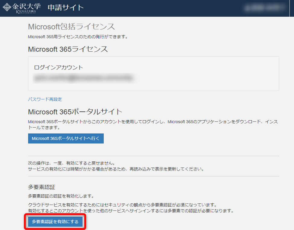 Microsoft365アカウント(@*.kanazawa.university)の多要素認証を登録します。多要素認証登録することでOneDriveやMicrosoft Teamsといったクラウドコミュニケーションサービスが利用可能になります。