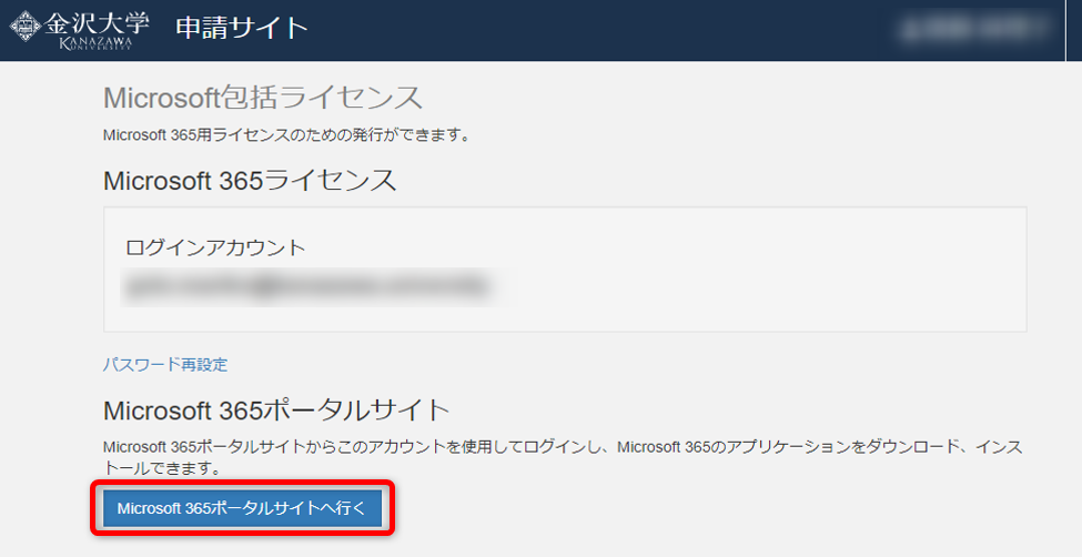 [5] 申請サイトに戻って、「Microsoft365ポータルサイトへ行く」をクリックします。