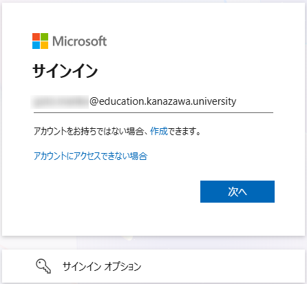 [6] サインインを求められますので、ご自身のMicrosoft365アカウント(@*.kanazawa.university)を入力して、「次へ」をクリックします。